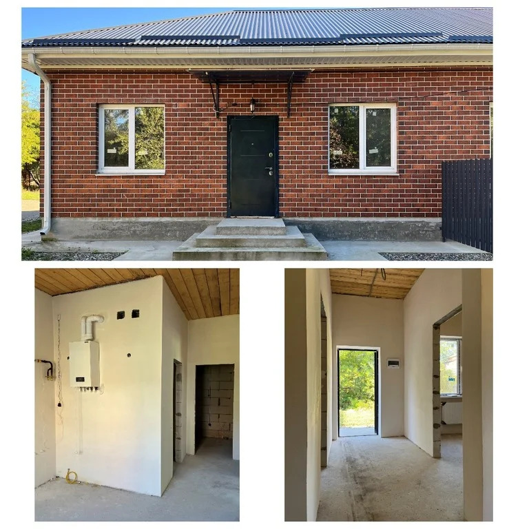 Планировка помещений: прихожая, коридор, две изолированные комнаты, кухня с панорамными окнами с выходом на террасу, совмещенный санузел, подсобное помещение. Индивидуальная система отопления, навесной котел, теплый пол, предчистовая отделка во всех помещениях.